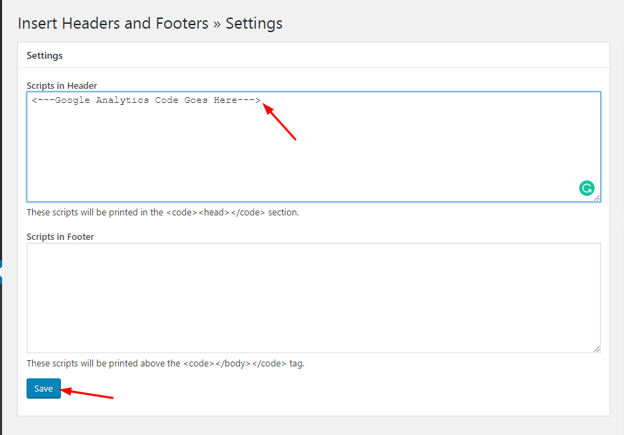 Paste the tracking code in the header field, save the settings. The code will be added to your theme’s header.