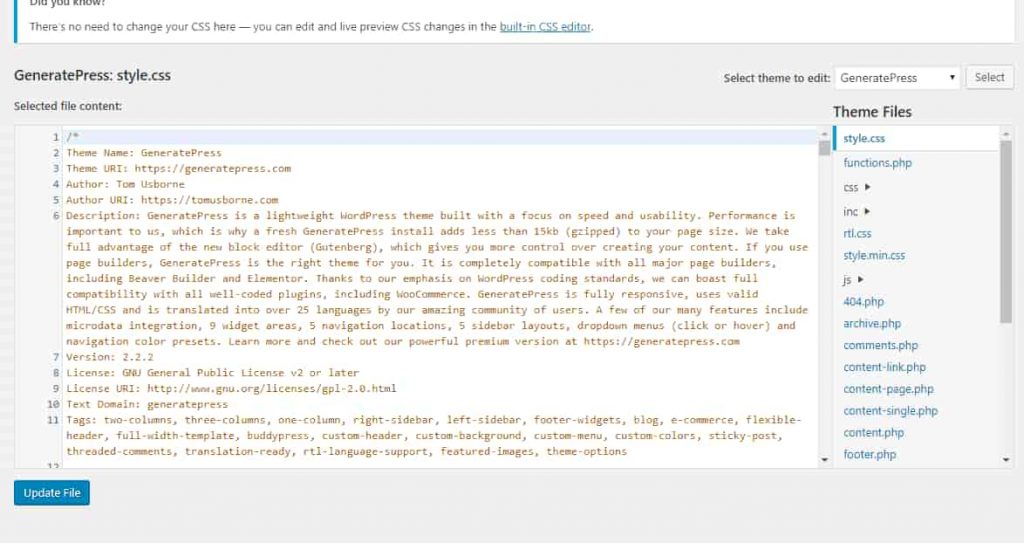 First of all, go to the WordPress theme editor. By default, the style.css file will be opened.